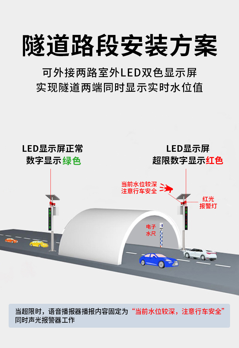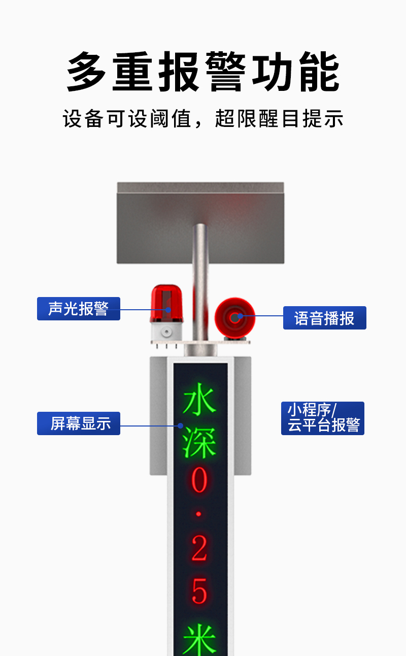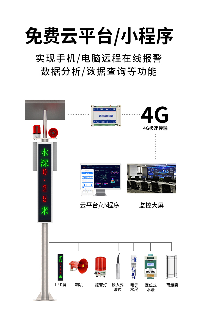 該系統(tǒng)不僅具備連續(xù)監(jiān)測功能,還可根據(jù)用戶需求靈活配置報警控制模塊。當水位超出預設安全值時,系統(tǒng)將立即啟動聲光報警,及時預警相關人員采取應急措施。監(jiān)測數(shù)據(jù)通過先進的無線傳輸技術實時同步至云平臺,支持多終端遠程訪問和集中管理,為城市防汛指揮和交通調度提供智能化決策支持。