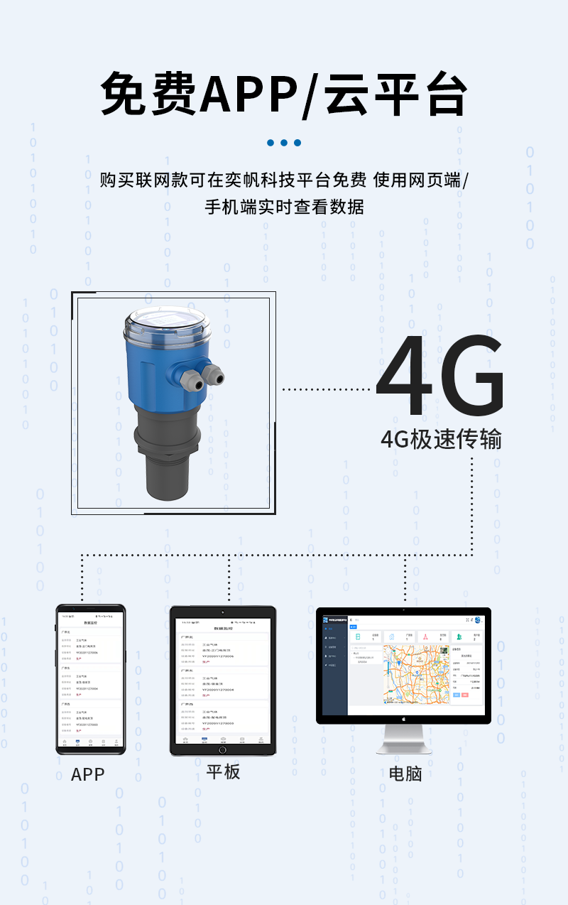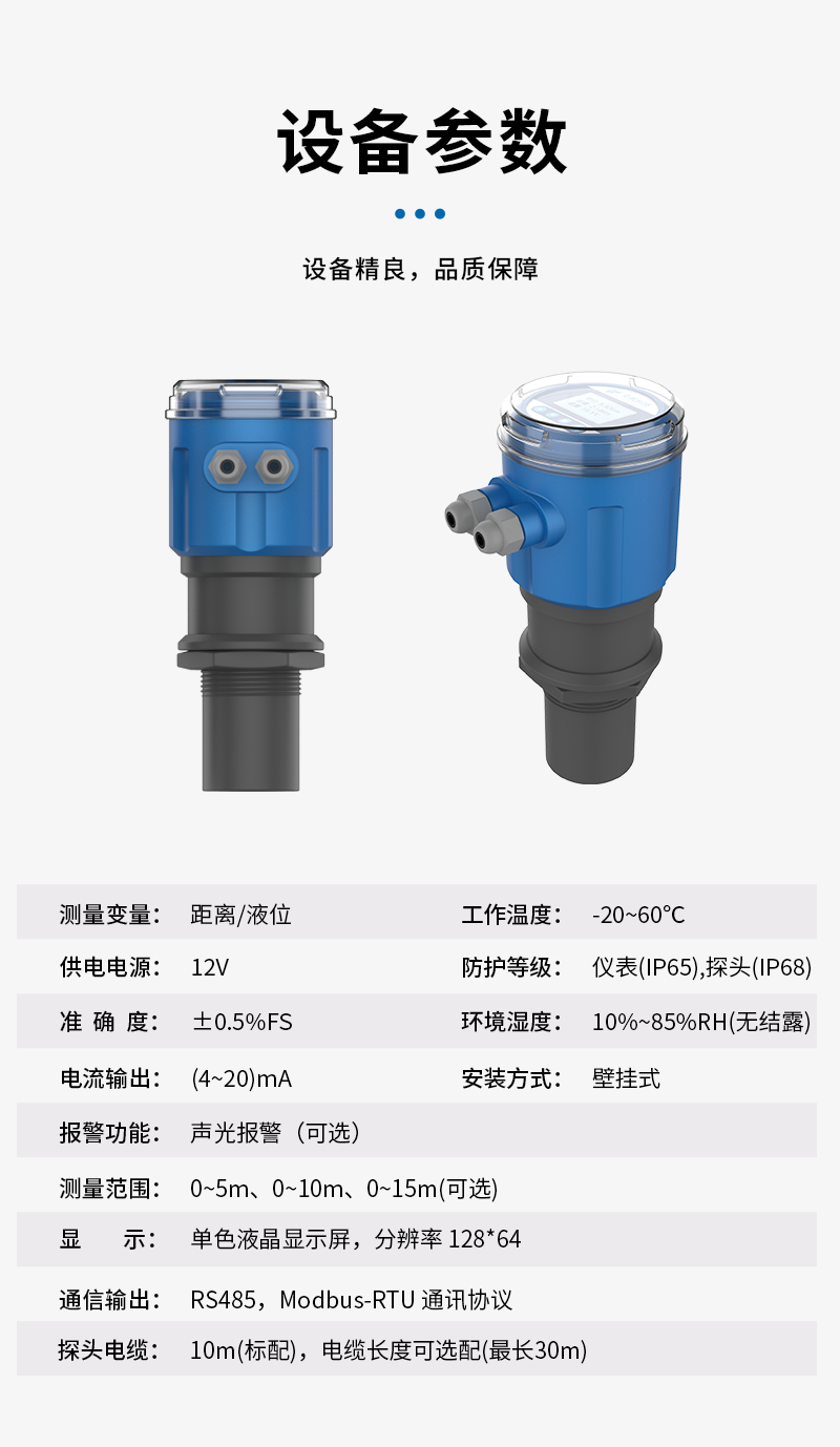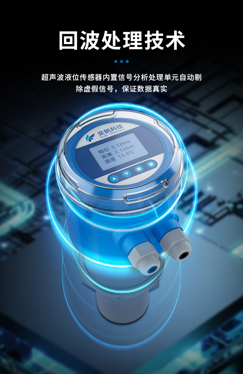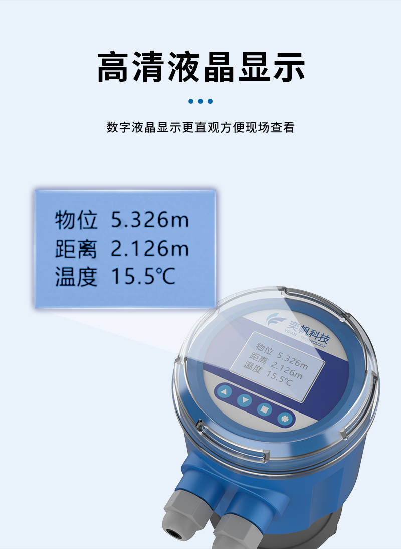YF-YWQP-V1奕帆科技 系列超聲波液位 /物位計采用超聲波脈沖原理進行非接觸式的測量,是一種非接觸式、高可靠性、高性價比、易安裝維護的物位測量儀器。它不必接觸介質就能滿足大部分物位測量要求,集液位水位測距顯示變送等功能于一體,被測介質幾乎不受限制,可廣泛應用于各種液體和固體物料高度的測量。