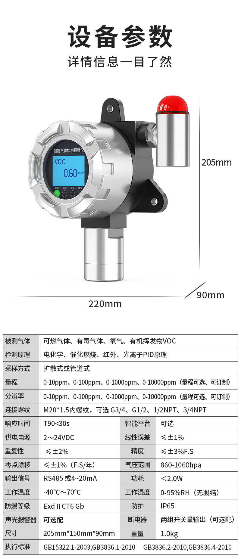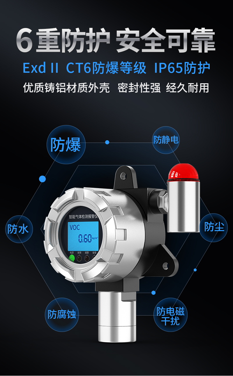 奕帆科技YF-8500系列防爆氣體檢測儀,可檢測上百種氣體(更換傳感器)。適用于石油化工等存在易燃易爆或有毒氣體的場所,可實時準確檢測氣體濃度。采用進口高精度傳感器和微控制器技術,響應速度快,測量精度高穩定性和重復性好等優點防爆接線方式活用于各種危險場所,并兼容各種控制報警器,PLC,DCS等控制系統,可以同時實現現場報警預警,4-20mA標準信號輸出,繼由器開關量輸出,易示各項技術指標和顯示濃度值,同時具有多種極的電路保護功能,有效防止各種人為因素,不可控因素導致的儀器損壞。